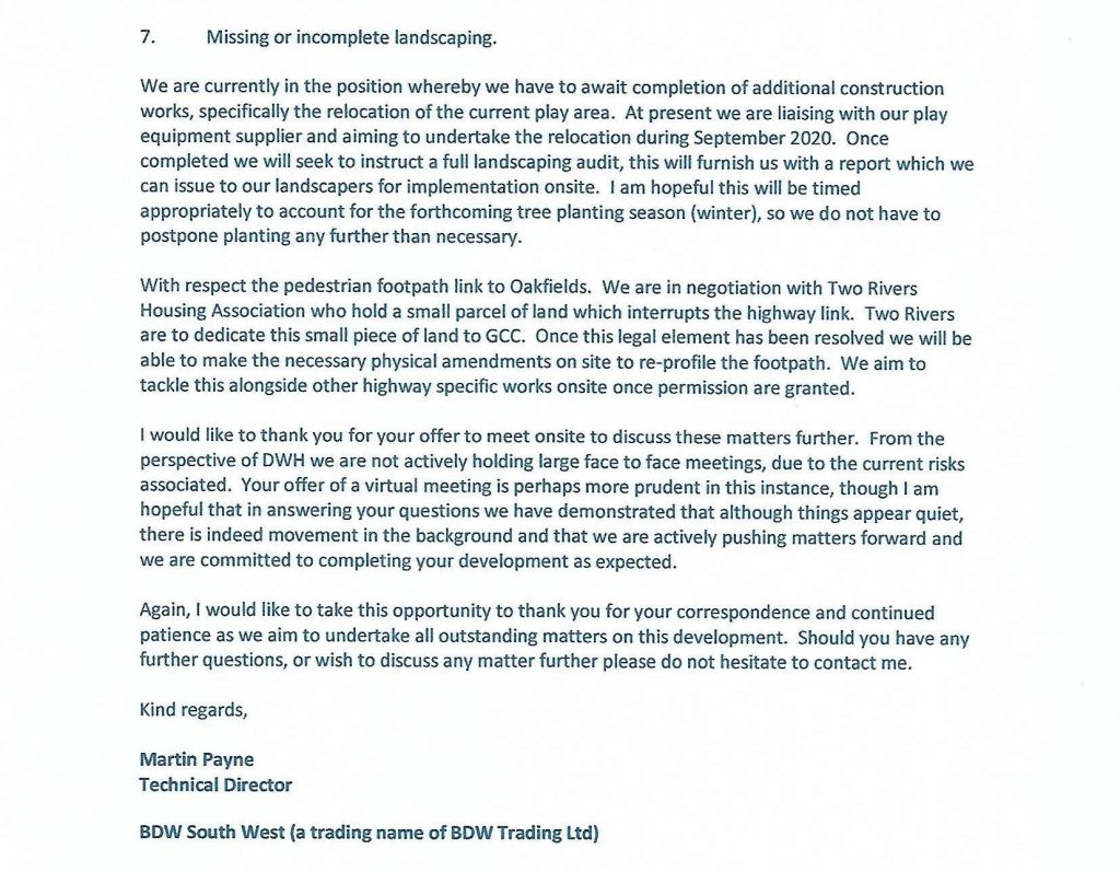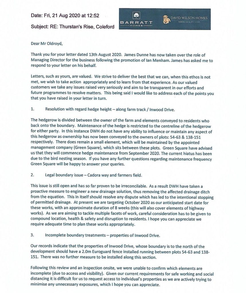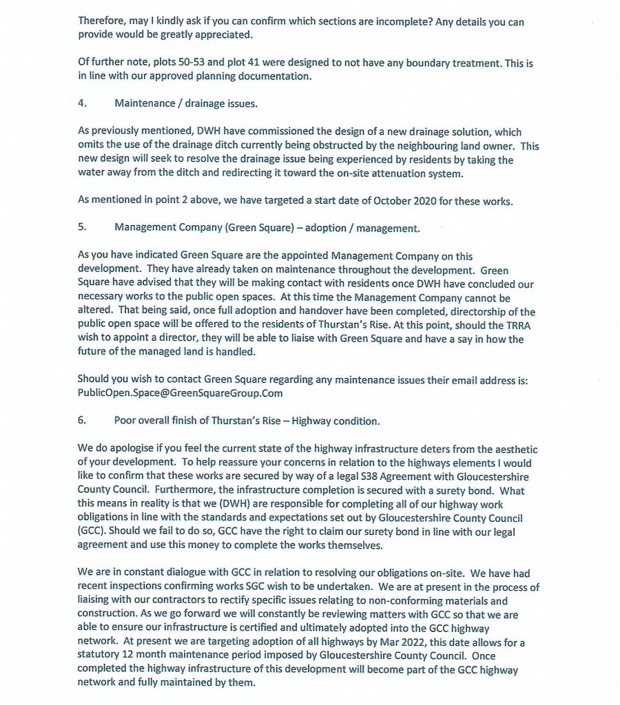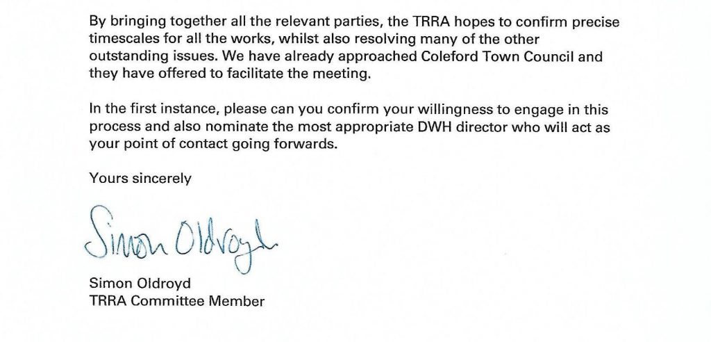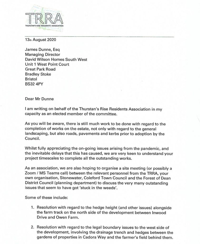 Now that the worst period of inactivity due to the Covid 19 ‘lockdown’ is over, the TRRA has been making efforts to stir David Wilson Homes into action, to deal with the many issues which remain outstanding since the building stages of the estate were completed over eighteen months ago. Committee member Simon Oldroyd, recently wrote to the Managing Director of DWH, highlighting many of these issues.