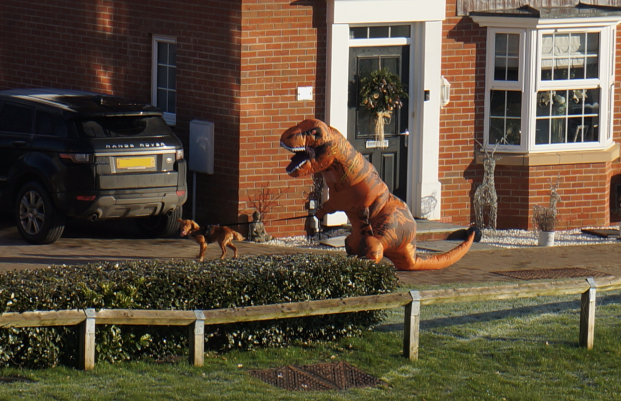 This image shows a rehearsal of the scene where a tethered goat is used as bait to attract the Tyrannosaurus Rex (brilliantly portrayed by our secretary, Donna Albon!) Due to budgetary constraints we were unable to source a goat, and had to substitute a small tethered dog. (If anyone is able to supply a goat costume for ‘Luna’ we would be most grateful.)